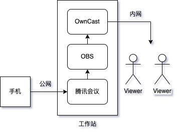 由于腾讯会议临时会议号每次会变,传播更新不是很方便。如固定会议号超过2个人,时长会有限制。所以我们重新包装了一层,降低传播的难度。OBS 采集腾讯会议的视频流,并可以做额外处理,例如增加时间图层,水印,亮度对比度调节,等。OwnCast 是开箱即用的直播平台,使用 RTMP 协议推流。如果工作站的上行带宽达不到百兆,很可能无法支持多人的直播服务,那就需要使用免费的公网直播平台,例如哔哩哔哩直播,企鹅直播,虎牙直播等,但是这会引入隐私问题。